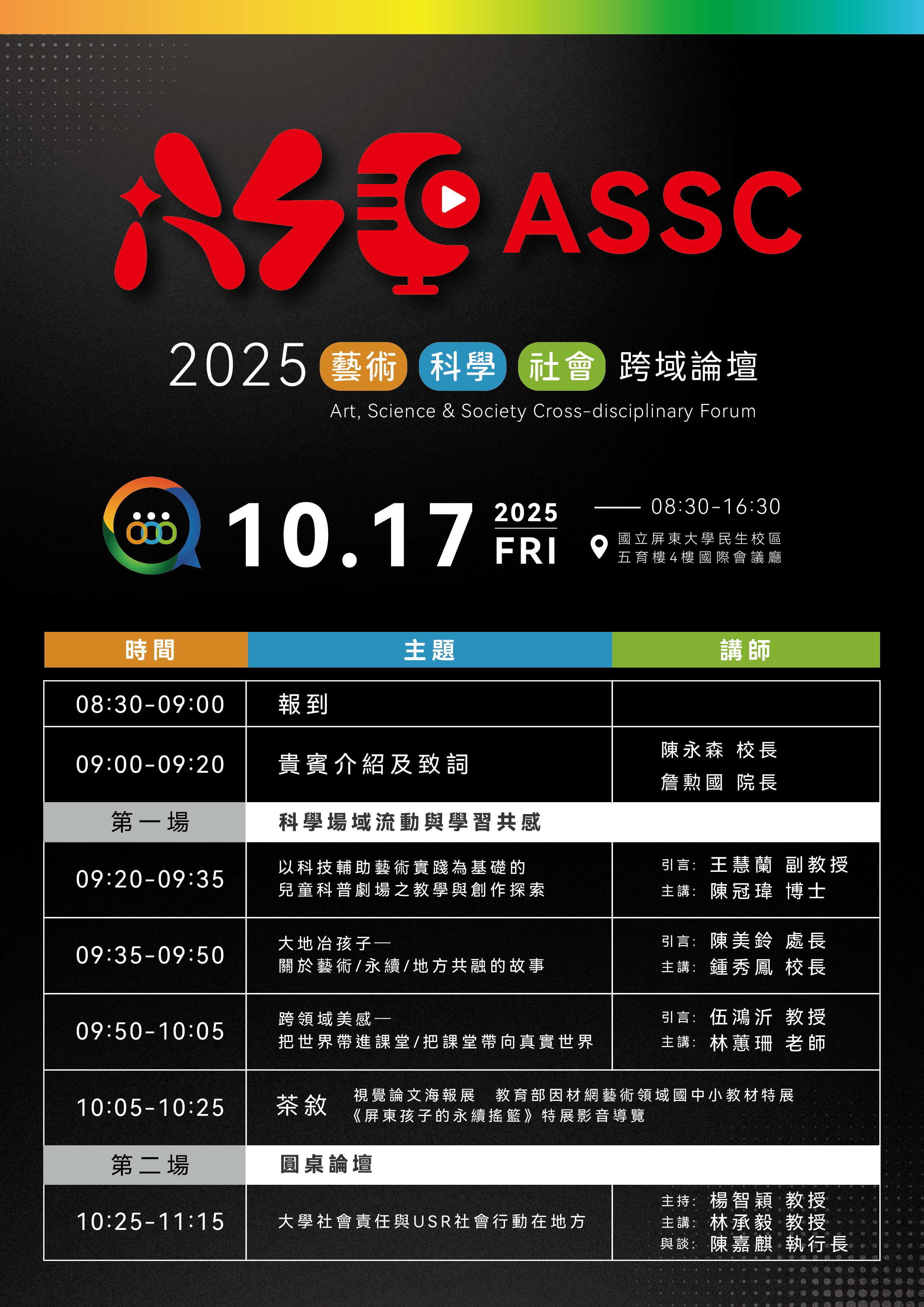 本論壇旨在探索藝術、科學與社會三者之間的知識建構與交互發展,促進跨領域的對話與創新。面對當代社會的複雜挑戰,藝術與科學不再是彼此分離的知識體系,而是共同回應社會需求、倫理思辨與公共感知的重要力量。本論壇期望成為一個匯聚多元觀點的公共場域,邀請學者、創作者、教育者與實務工作者共同參與,激發跨界思維與實踐。